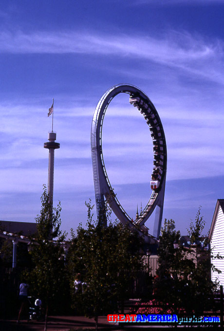 The Sky Trek tower is seen to the left of the Tidal Wave's loop.