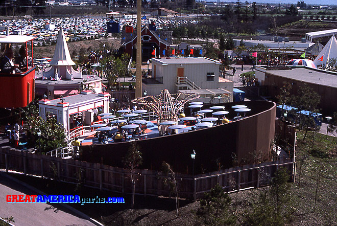 Passengers on the Delta Flyer / Eagle's Flight skyride pass above the Fiddler's Fling. You can still do this at Santa Clara, except that the Fiddler's Fling has been renamed as Centrifuge. Fiddler's Fling remains in operation at Gurnee, too. But the Delta Flyer / Eagle's Flight was removed there in 1984.